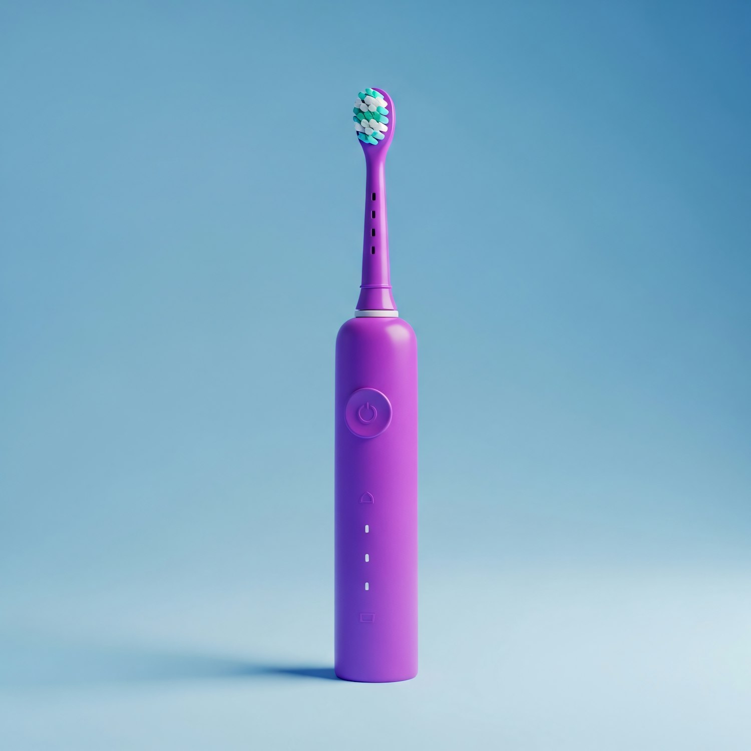 A sleek purple electric toothbrush with teal and white bristles, set against a clean blue gradient background.