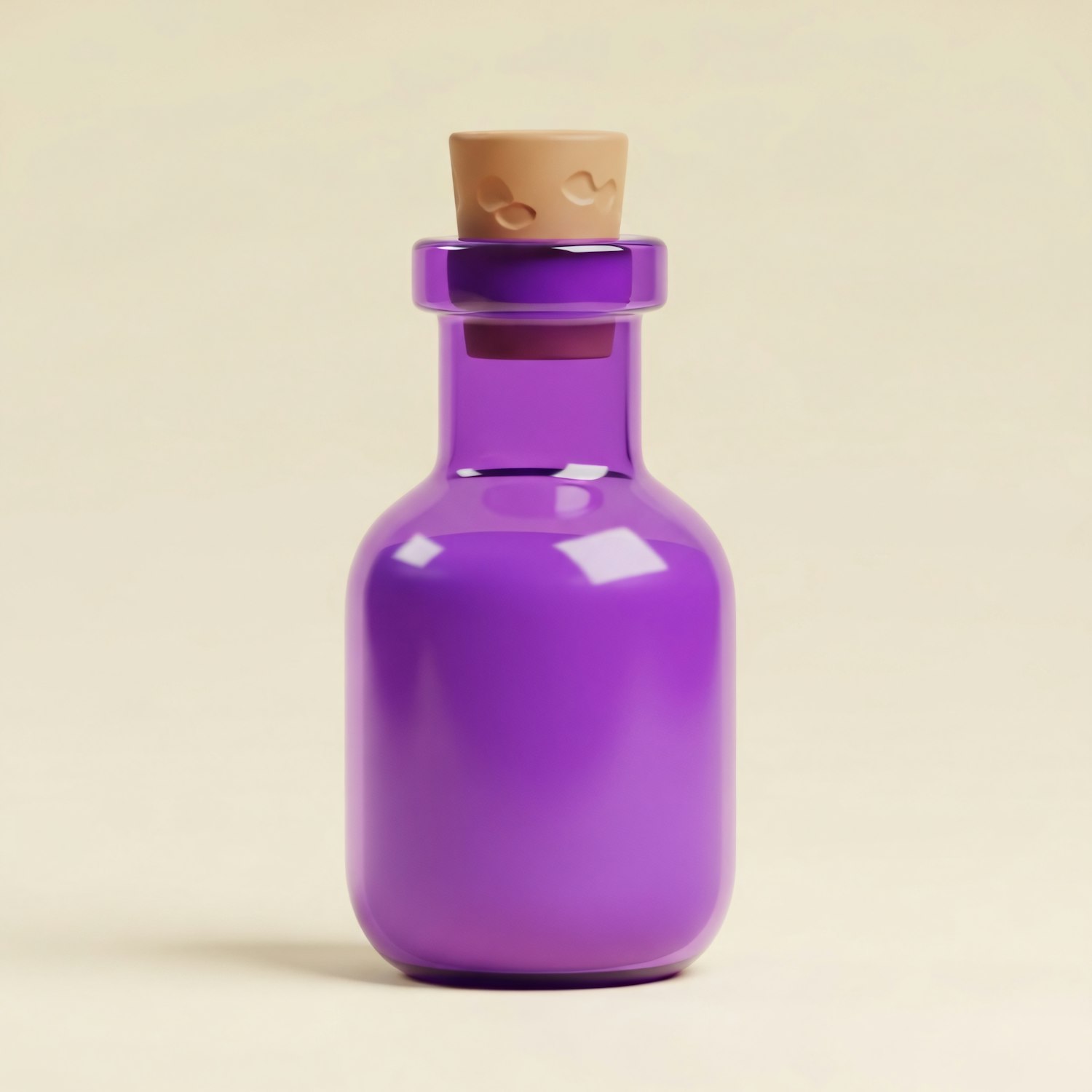 A vibrant purple glass bottle with a beige cork stopper, set against a neutral background, showcasing its glossy and smooth surface.