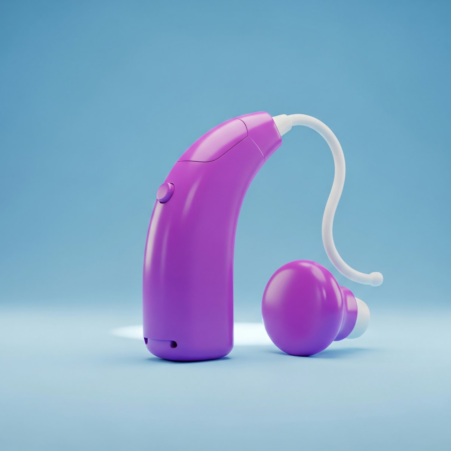 A sleek purple hearing aid with a white ear hook and earbud, set against a clean blue background, showcasing its modern design.