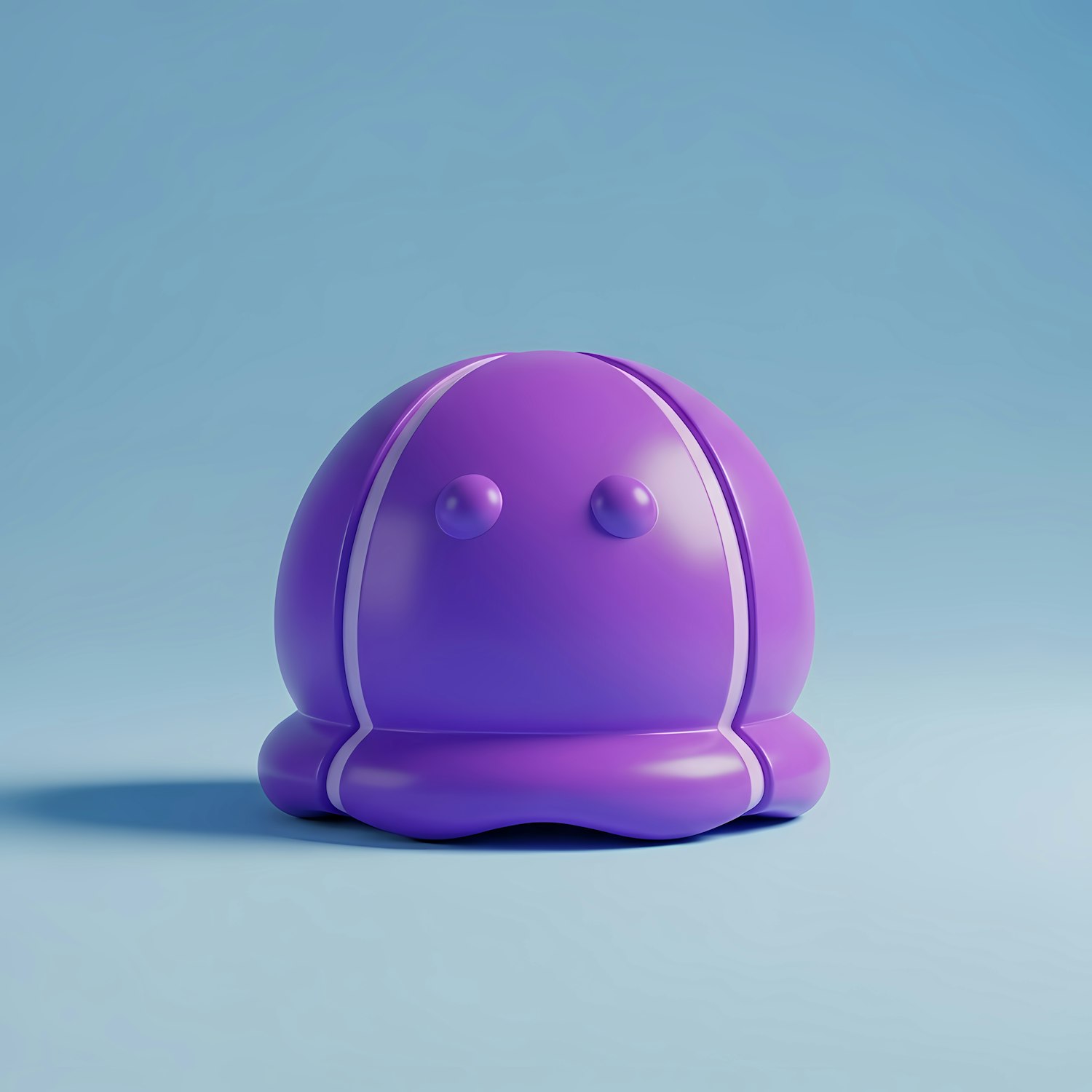 A cute 3D-rendered purple jellyfish-like character with a glossy finish, set against a clean blue gradient background.