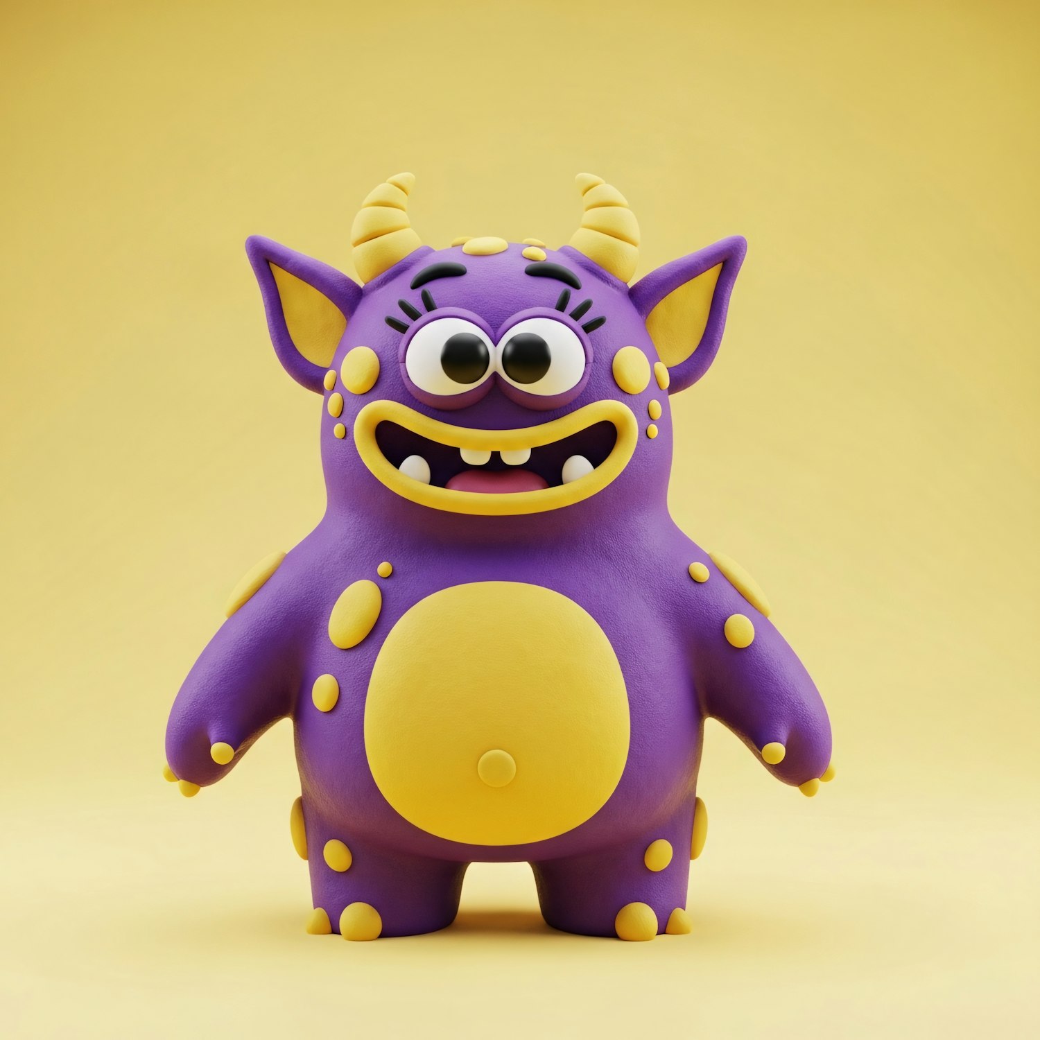 A cute purple and yellow cartoon monster with big eyes and a toothy grin, set against a bright yellow background.