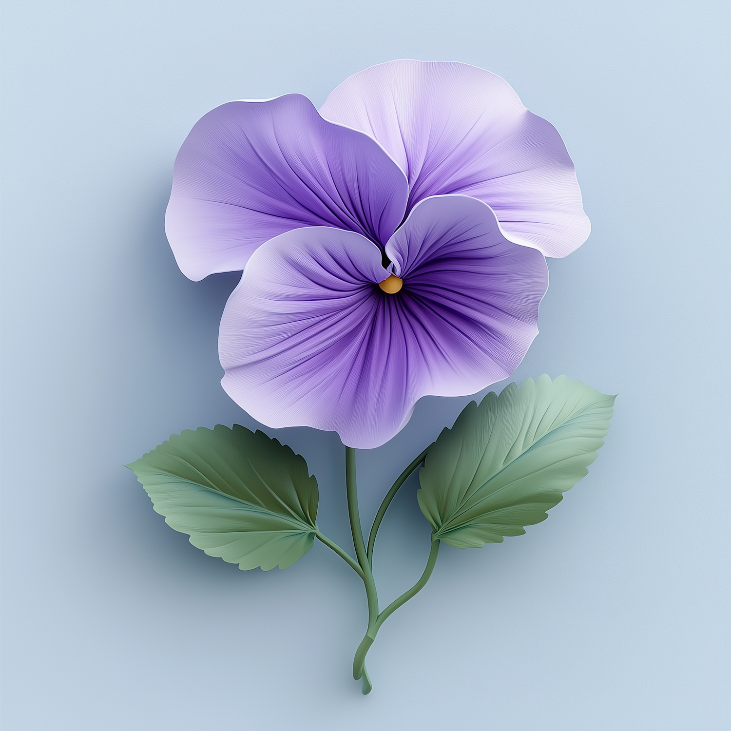 A stunning purple pansy illustration with detailed petals and green leaves on a soft blue background. Perfect for floral art lovers.