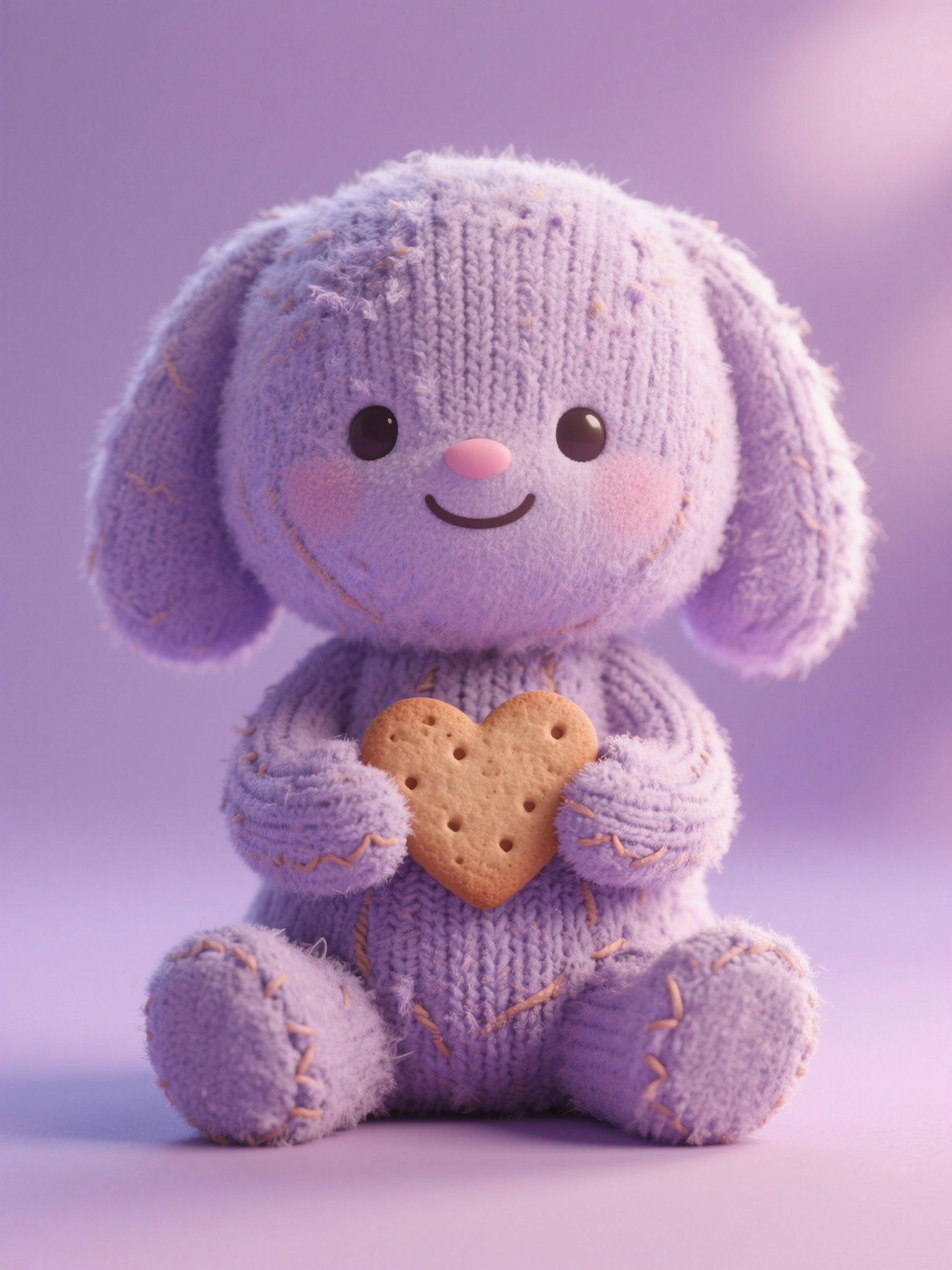 A soft 3D character made of plush or knitted fabric, with a cute cartoon face, holding a heart-shaped cookie, pastel lilac background, hyper-realistic texture, Pixar style lighting, highly detailed and soft-focused render