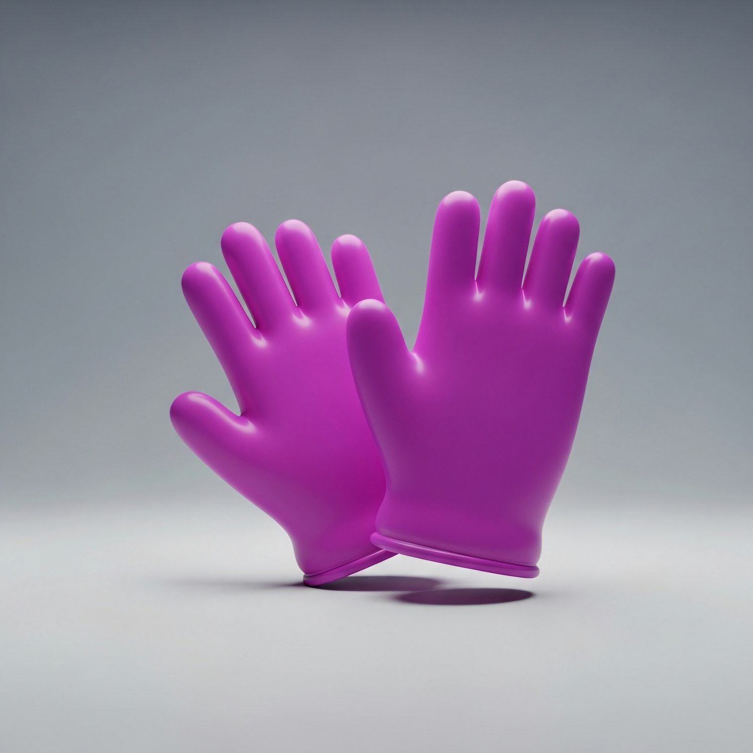 Bright purple rubber gloves standing upright on a neutral background, showcasing their glossy texture and vibrant color.