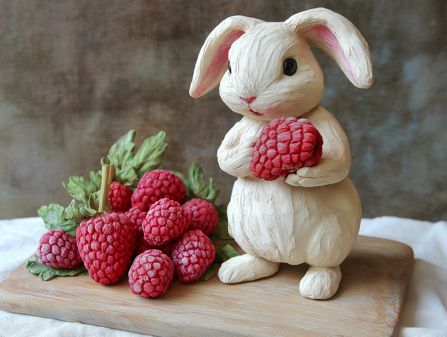 Clay sculpture of a white rabbit holding a raspberry, surrounded by realistic raspberries on a wooden board.