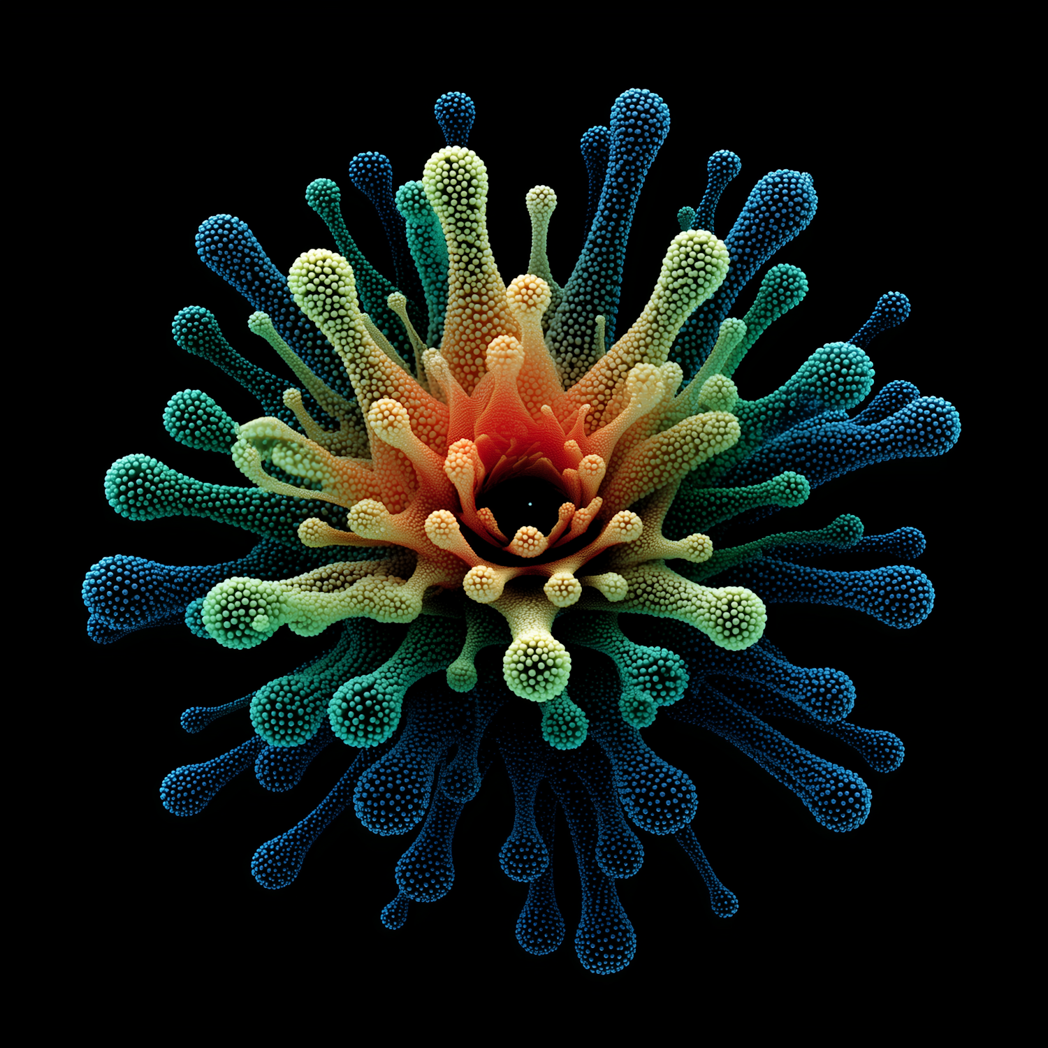 A colorful, abstract 3D artwork resembling a flower or coral, with vibrant gradients and intricate textures on a black background.