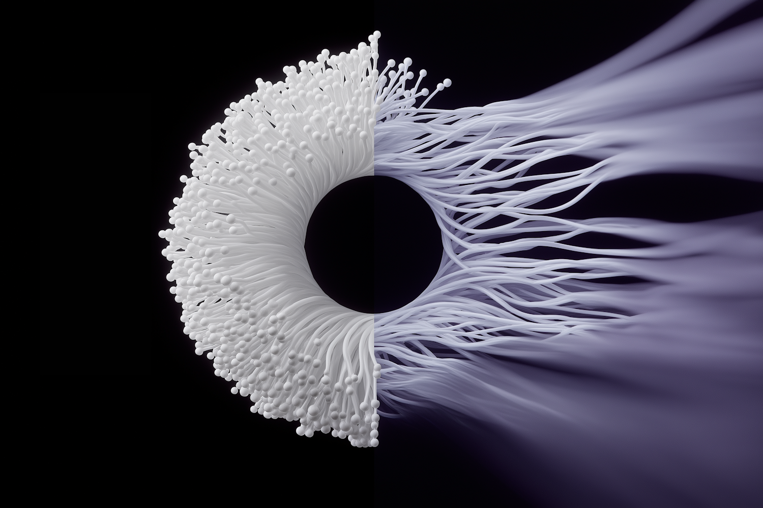 A mesmerizing 3D-rendered circular structure with flowing strands and a black background, showcasing intricate details and dynamic textures.