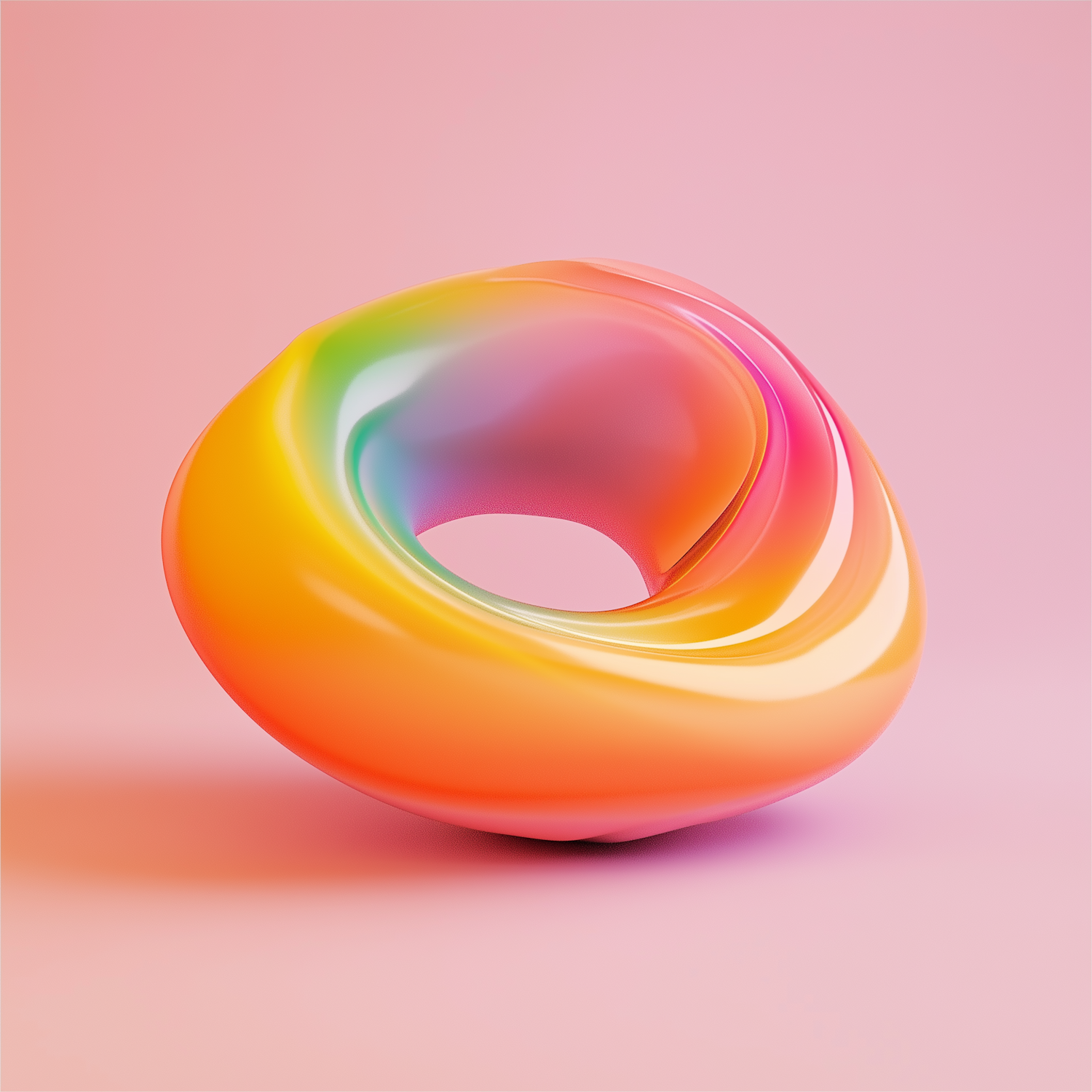 A glossy, rainbow-gradient 3D torus with fluid curves set against a soft pink background, creating a vibrant and modern abstract design.