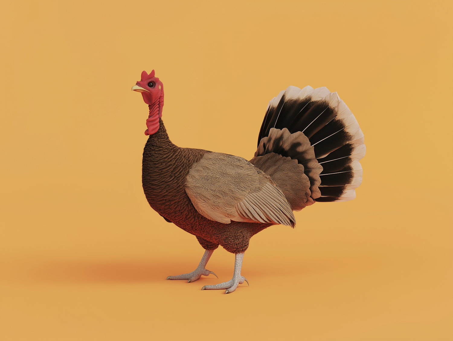 Realistic 3D rendering of a turkey with detailed feathers against a vibrant orange background.