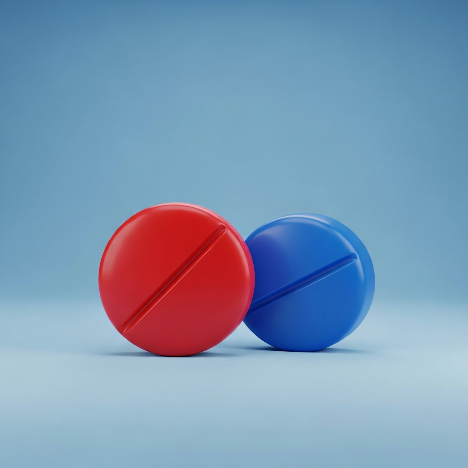 A red and a blue pill-like object leaning together on a smooth blue background, showcasing vibrant colors and a clean design.