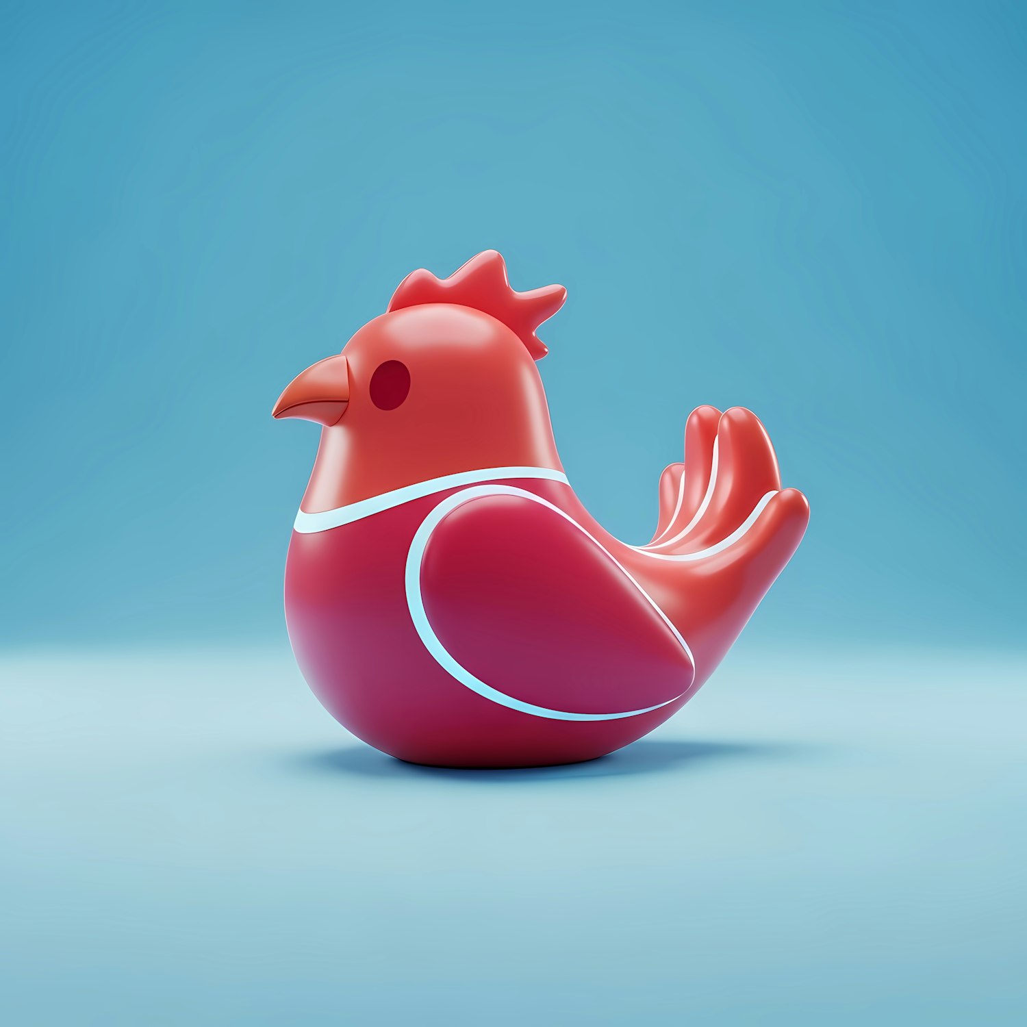 A vibrant 3D-rendered red chicken figurine with a glossy finish, set against a clean blue background. Perfect for modern decor.