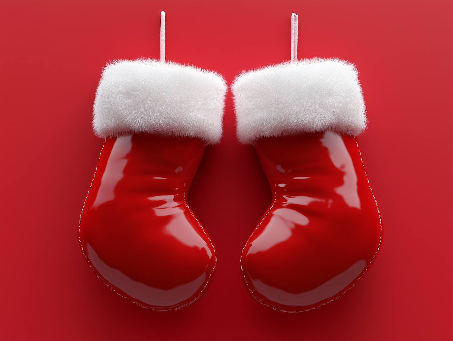 Two glossy red Christmas stockings with white fur cuffs on a red background, perfect for festive holiday decor.