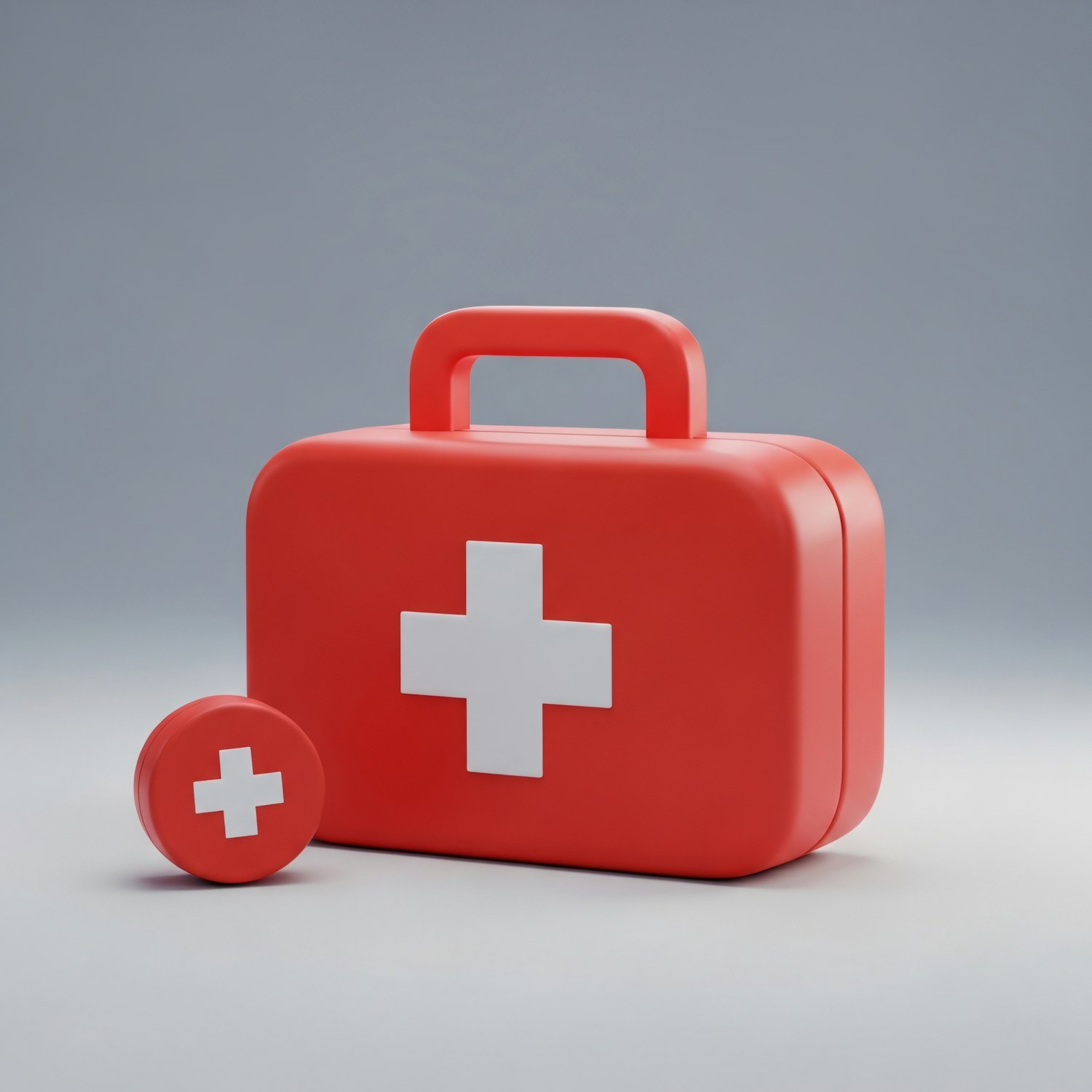 A red first aid kit with a white cross and a matching circular container, set against a neutral background.