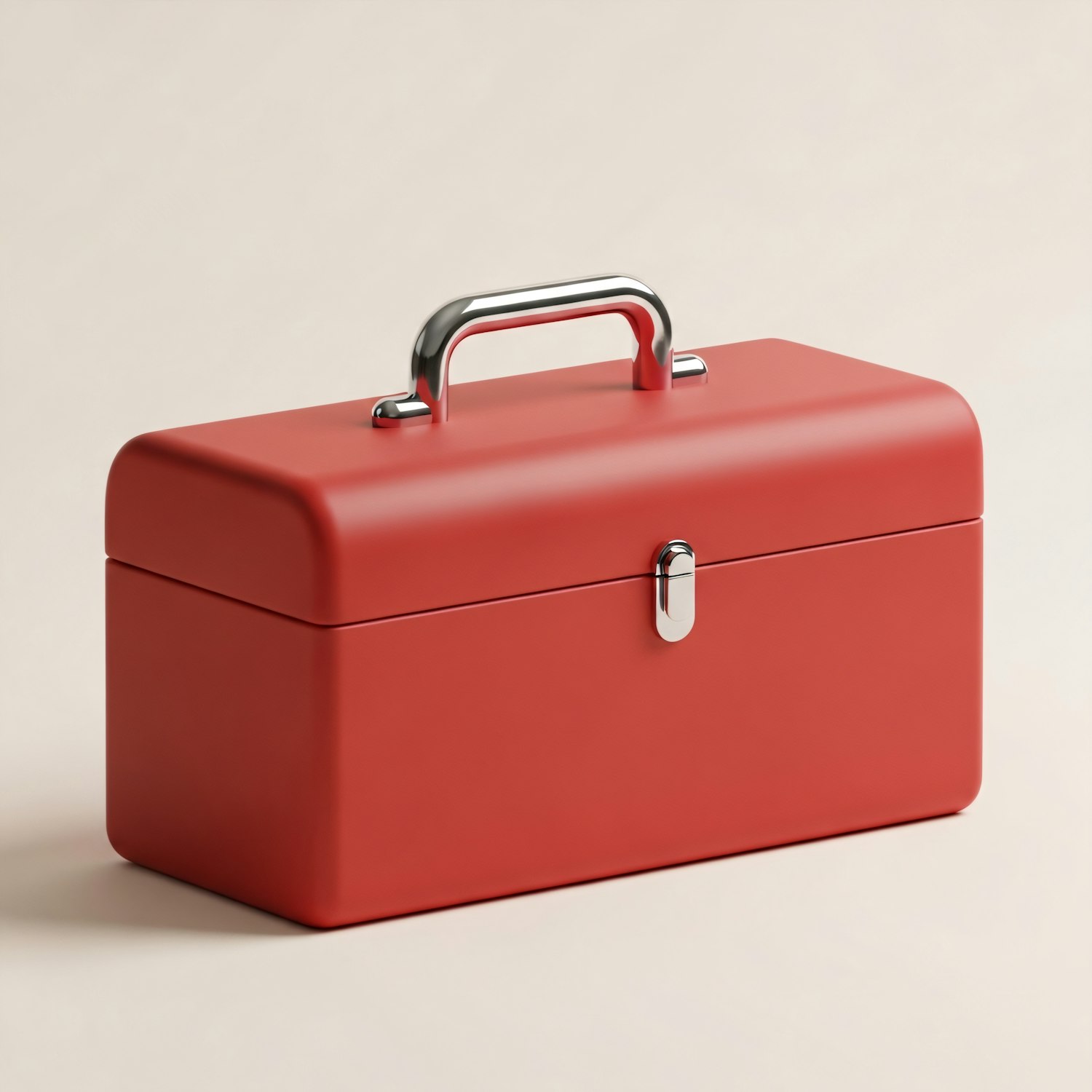 A sleek red toolbox with a metallic handle and latch, set against a neutral background, showcasing its modern and minimalistic design.