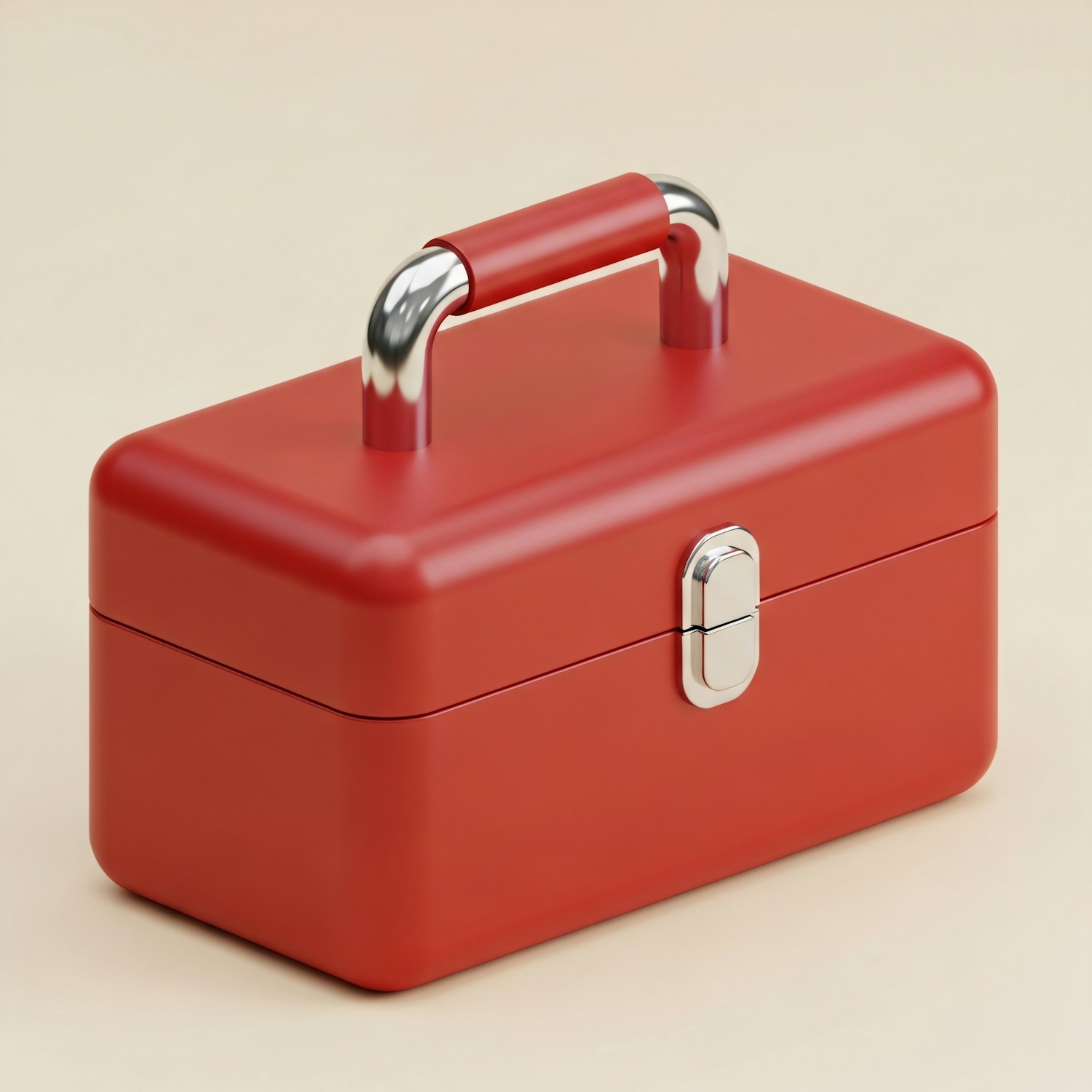 A sleek red toolbox with a metallic handle and latch, perfect for organizing tools or small items in a stylish and practical way.