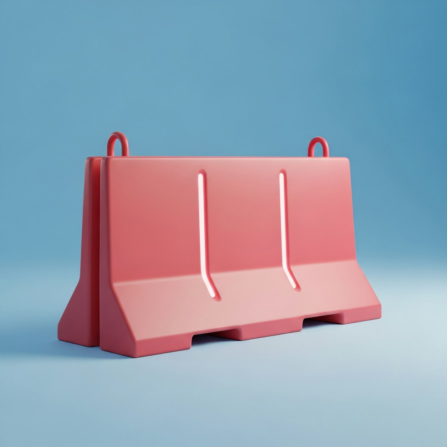 A red plastic traffic barrier with a smooth surface and handles, set against a light blue background, showcasing its functional design.