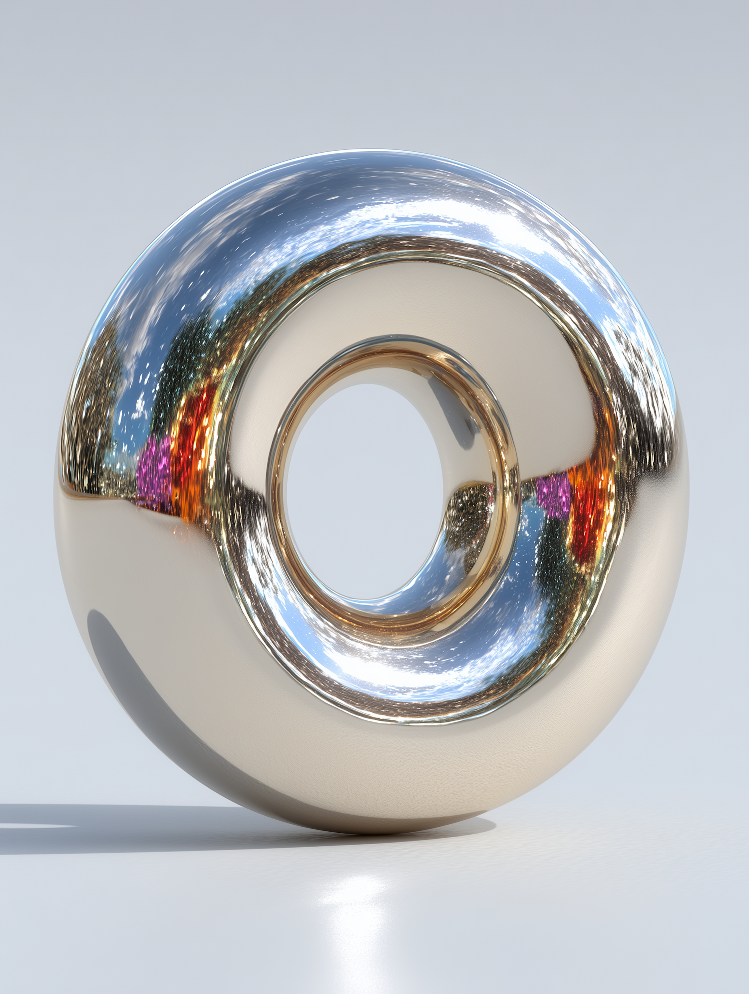 A reflective metallic torus with vivid reflections, set against a neutral background, showcasing its polished surface and vibrant colors.