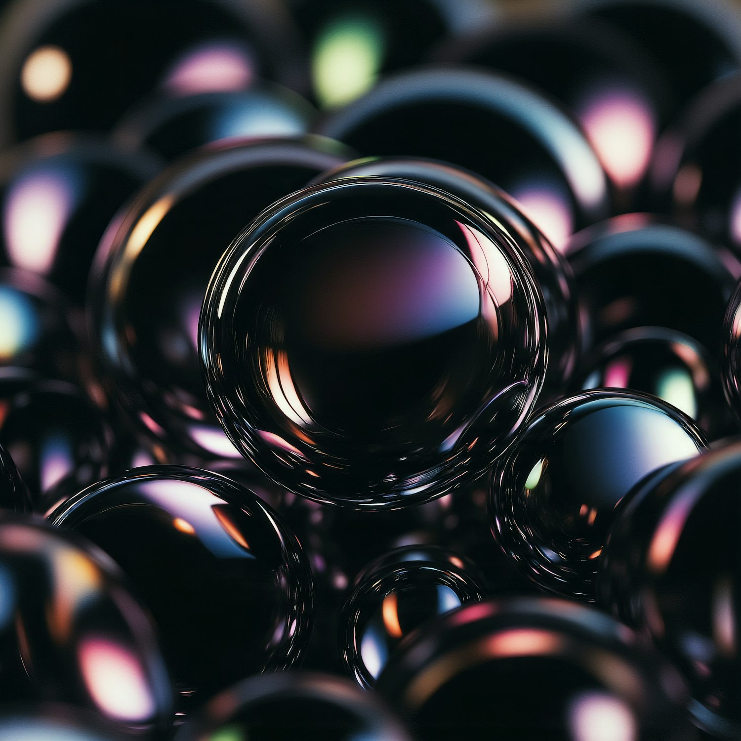 A close-up of glossy, reflective spheres with colorful light reflections, creating a vibrant and abstract visual effect.