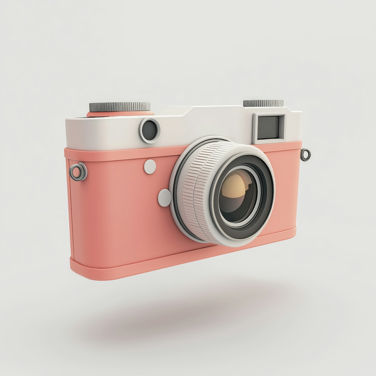 A pastel pink and white retro-style camera in a clean 3D rendering, showcasing a vintage aesthetic with detailed lens and dials.