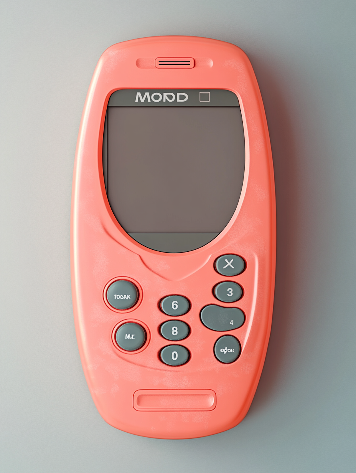 Bright coral retro-style phone with a small screen and circular keypad, evoking early 2000s mobile designs. Simple and nostalgic.