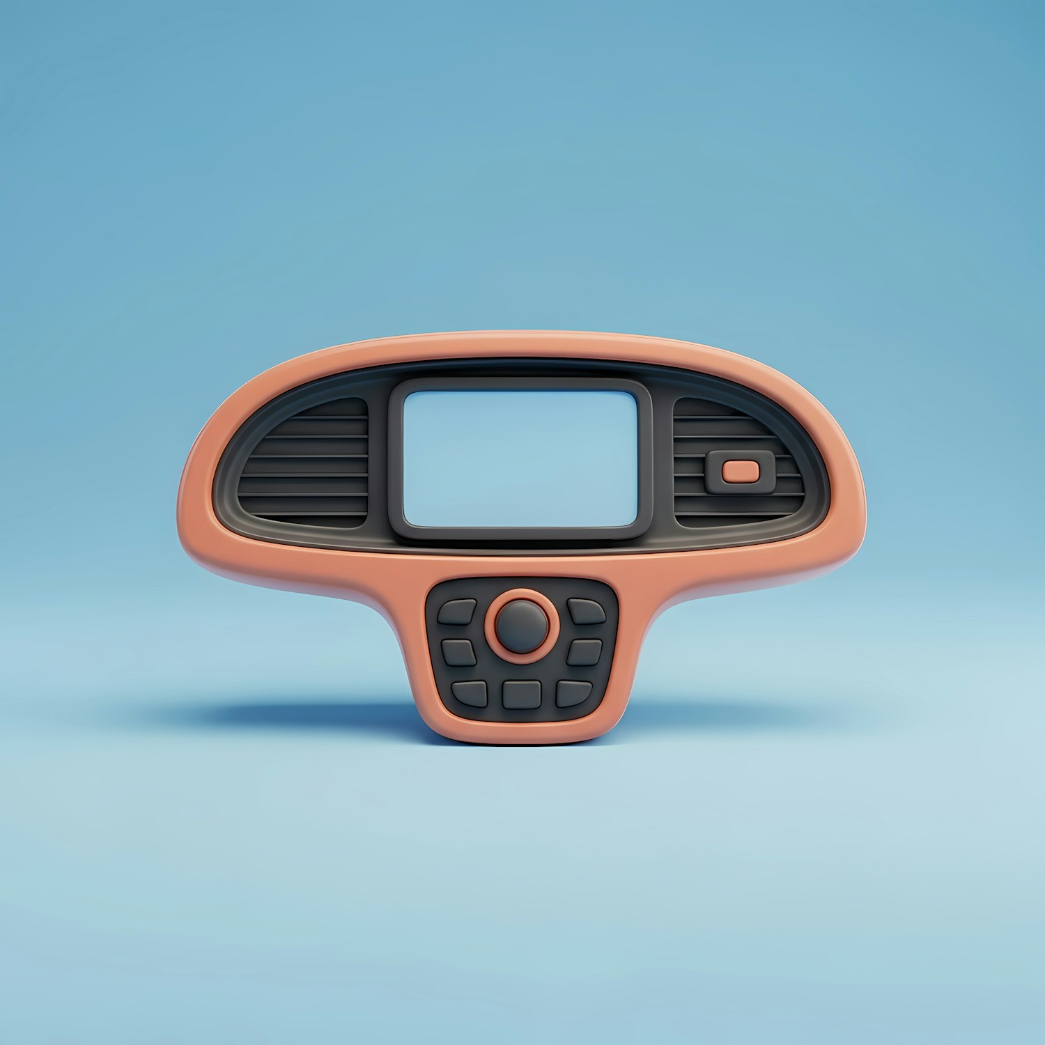 A 3D-rendered retro-style dashboard with a peach frame and black controls, set against a clean blue background.