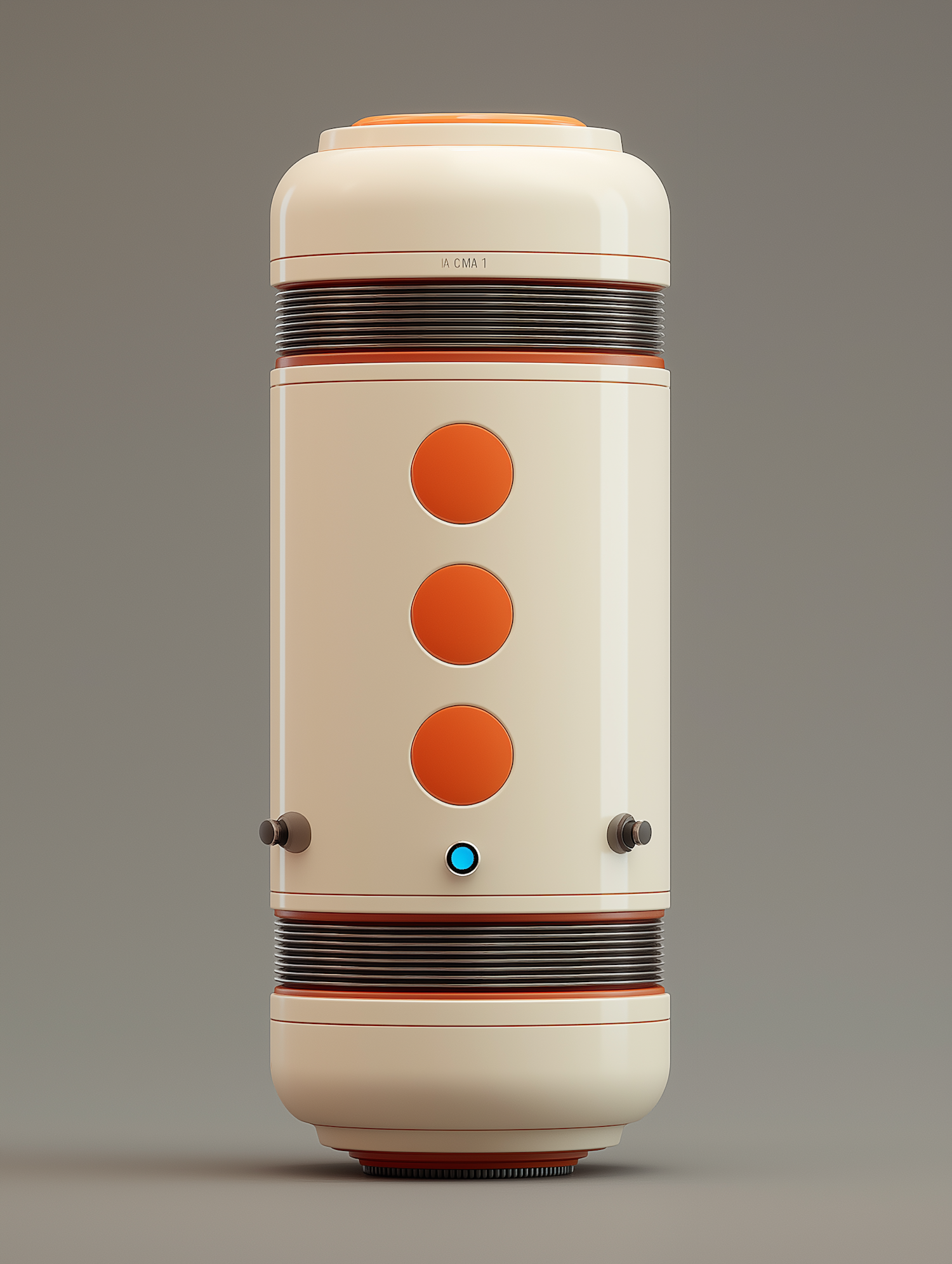 Retro-futuristic cylindrical device with cream and orange accents, featuring circular details and metallic ridges on a neutral background.