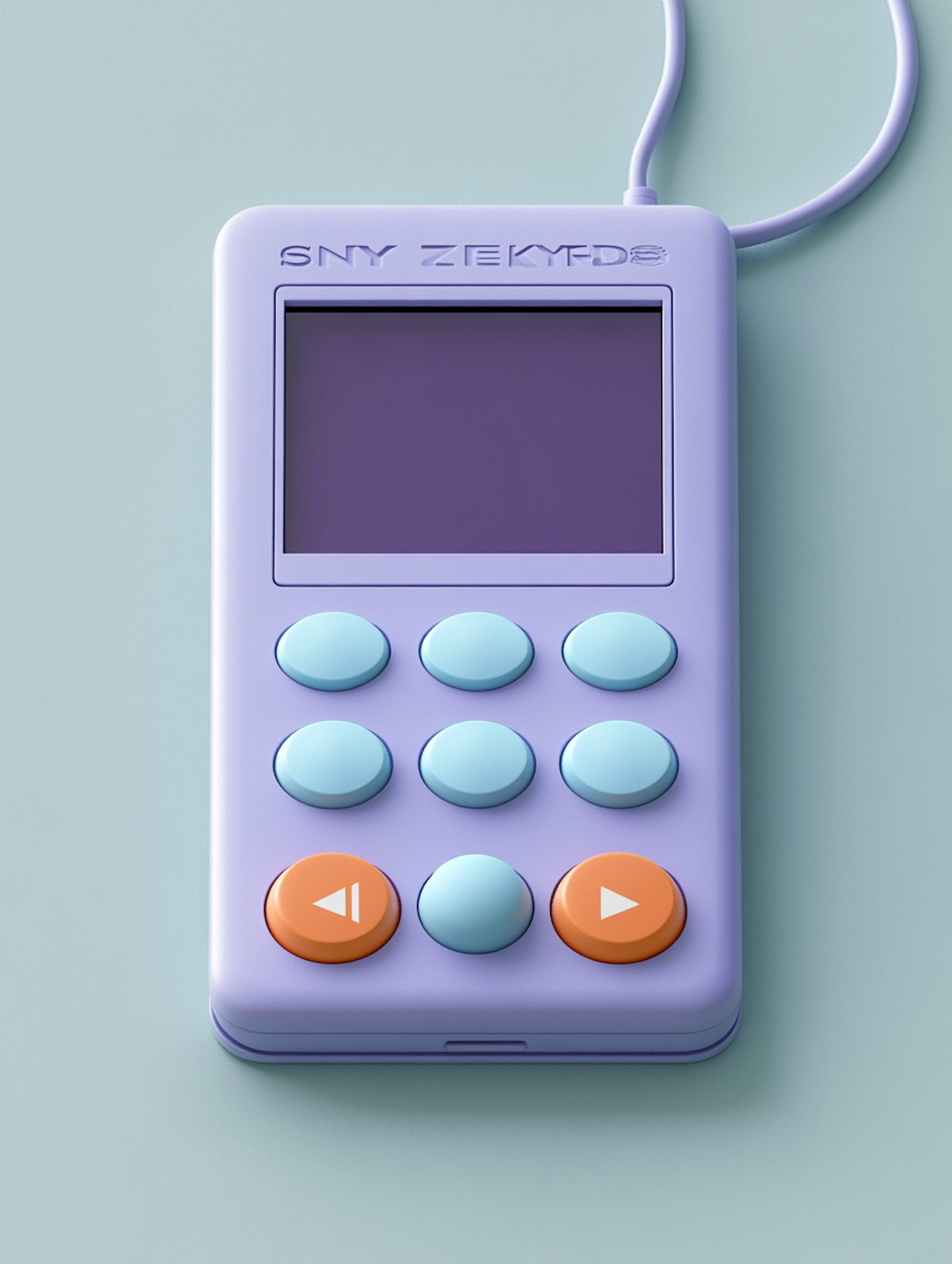 Retro-inspired pastel purple gadget with light blue and orange buttons, a small screen, and a connected cable on a mint green background.