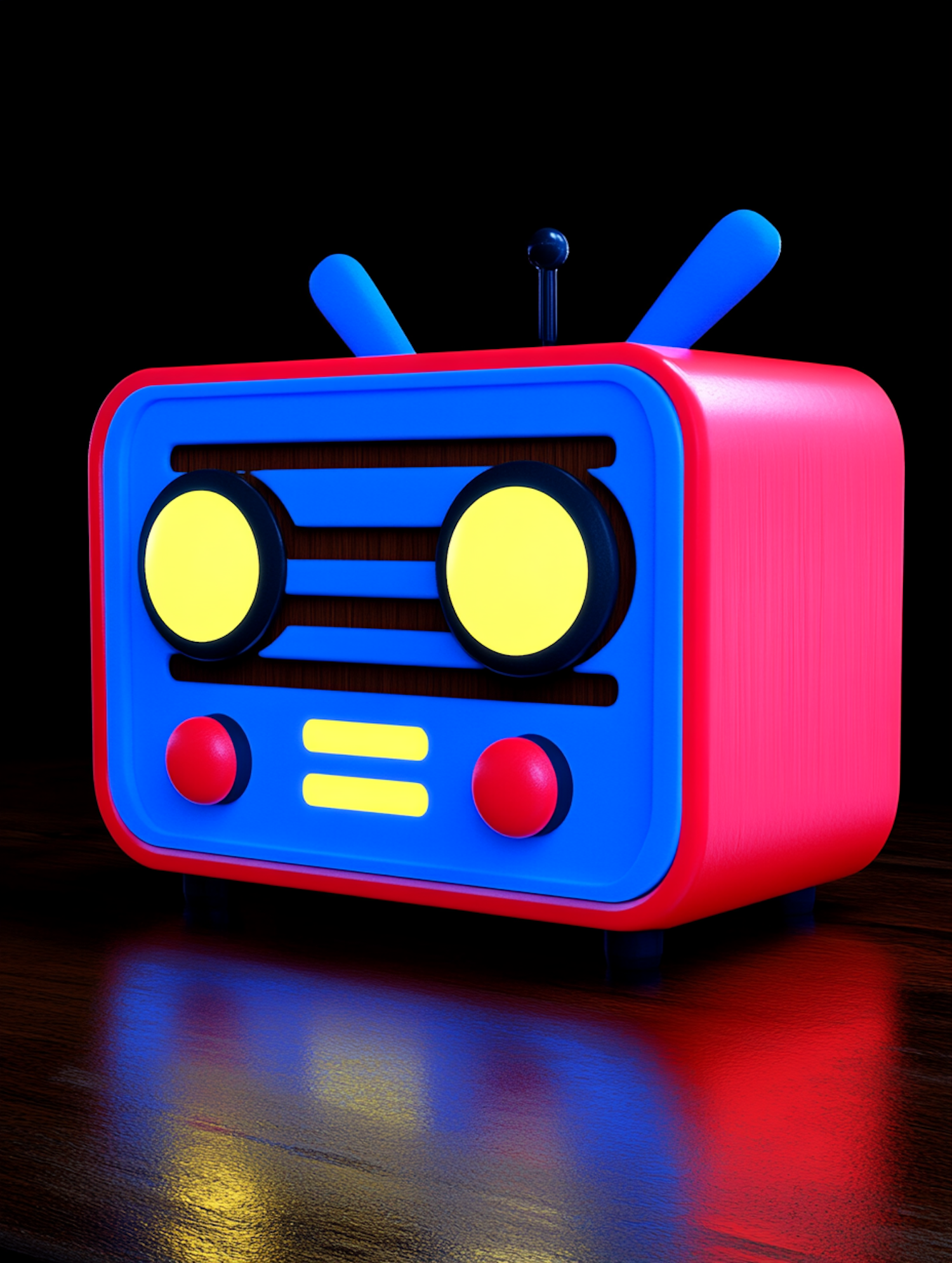 A colorful 3D retro radio with a playful face-like design, featuring bright red, blue, and yellow accents on a dark background.