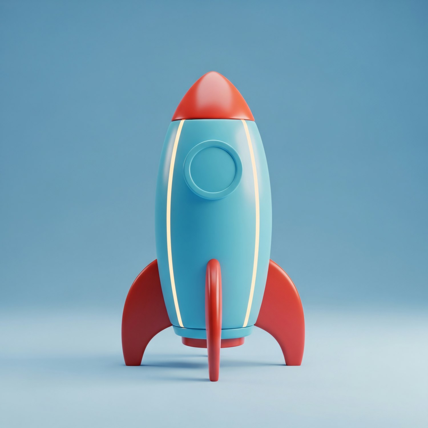A colorful retro-style rocket model with a blue body and red fins, set against a clean blue background, perfect for creative projects.