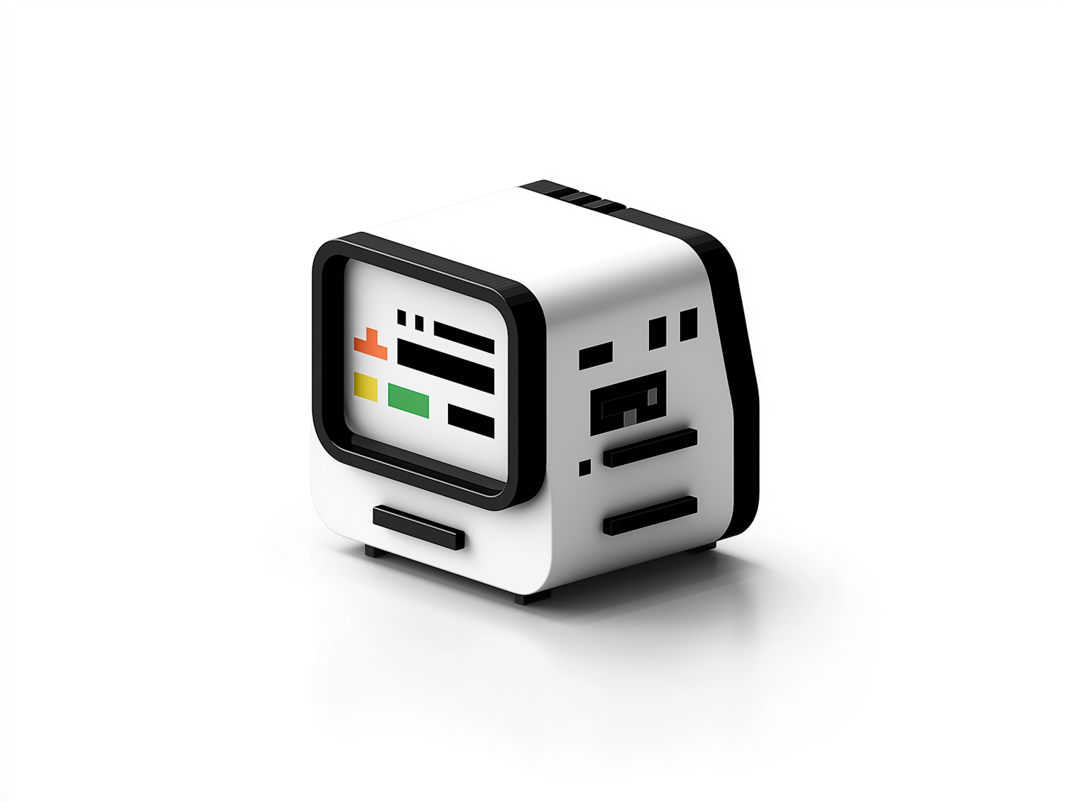 Compact retro-style computer with a white body, black accents, and a colorful dashboard display. Sleek, modern, and minimalistic design.