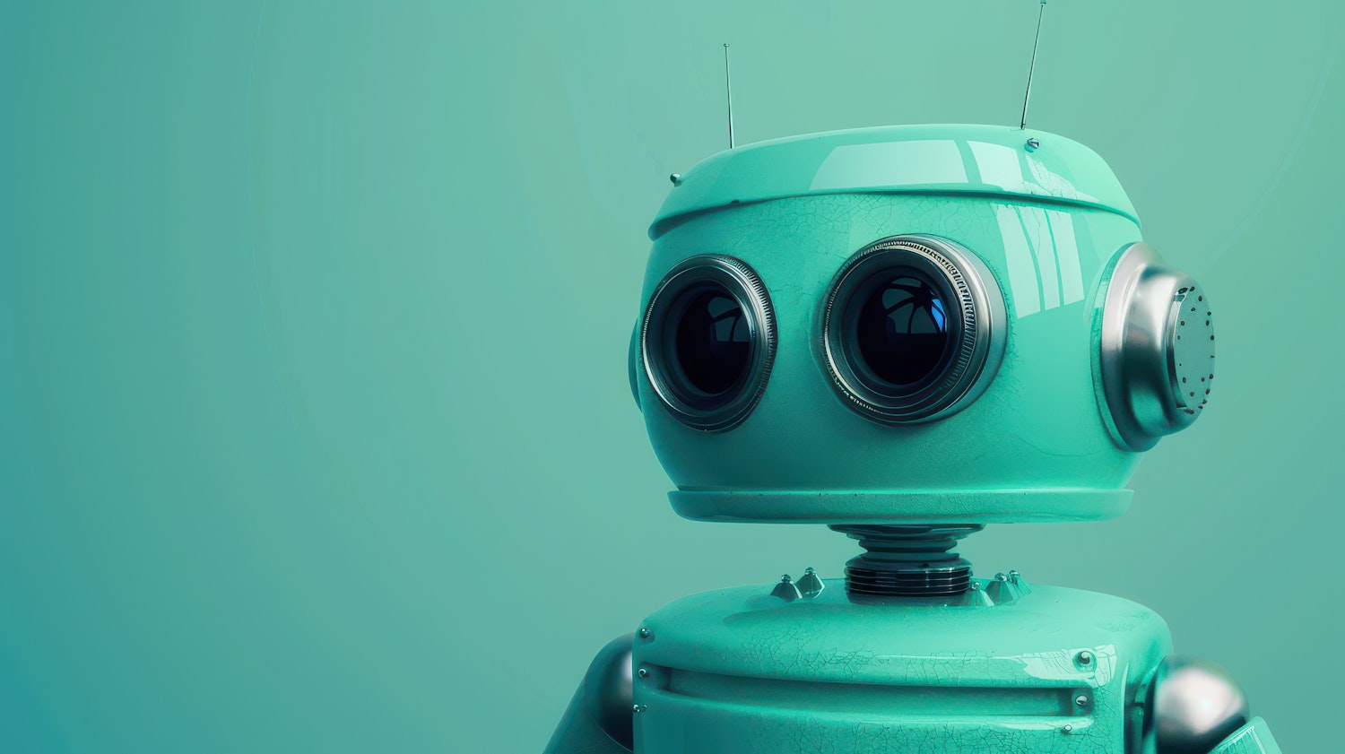 Retro teal robot with large camera-like eyes and antennas, set against a matching teal background. Nostalgic and futuristic design.