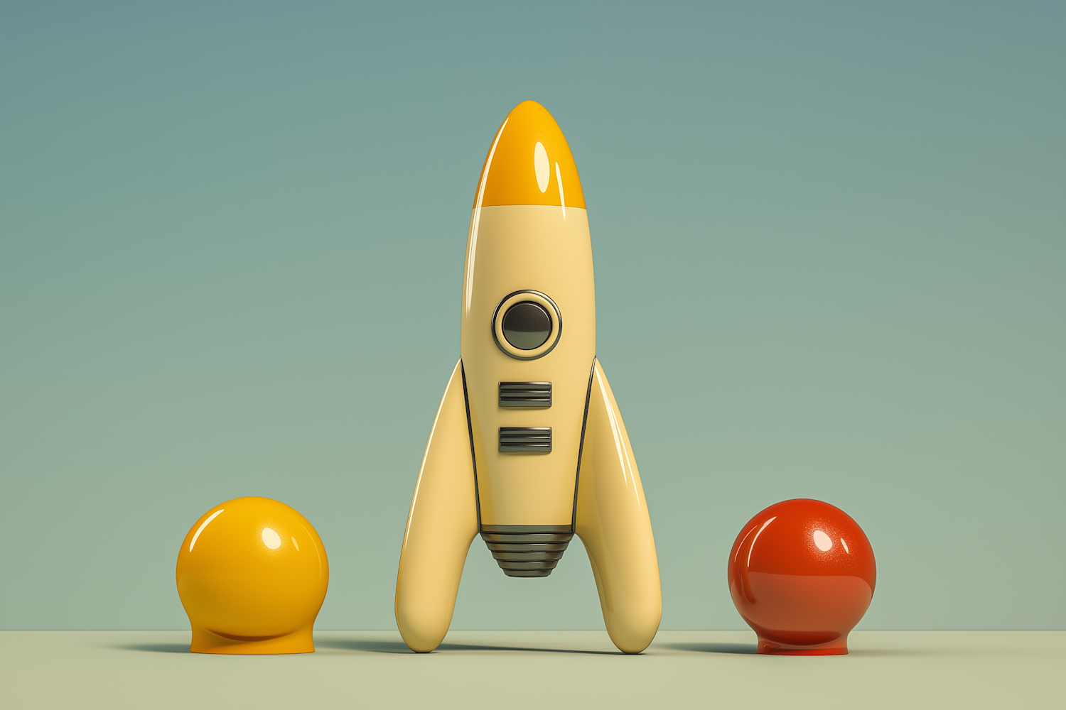 A retro-style yellow rocket with orange tip, flanked by glossy yellow and red spheres, set against a teal gradient background.