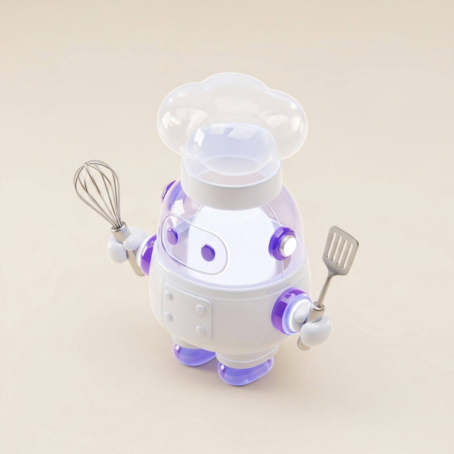 A cute 3D robot chef holding a whisk and spatula, designed with a white and purple color scheme and a transparent chef's hat.