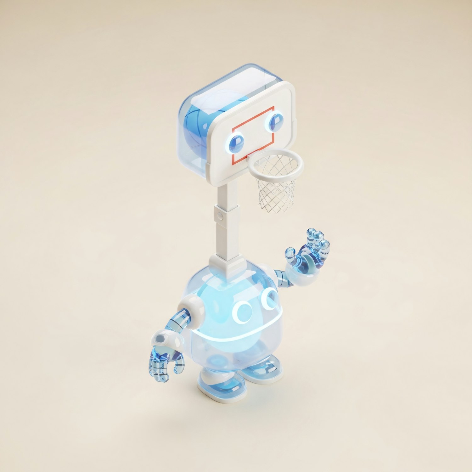 A playful 3D robot with a basketball hoop head and translucent blue body, perfect for creative and futuristic design inspiration.