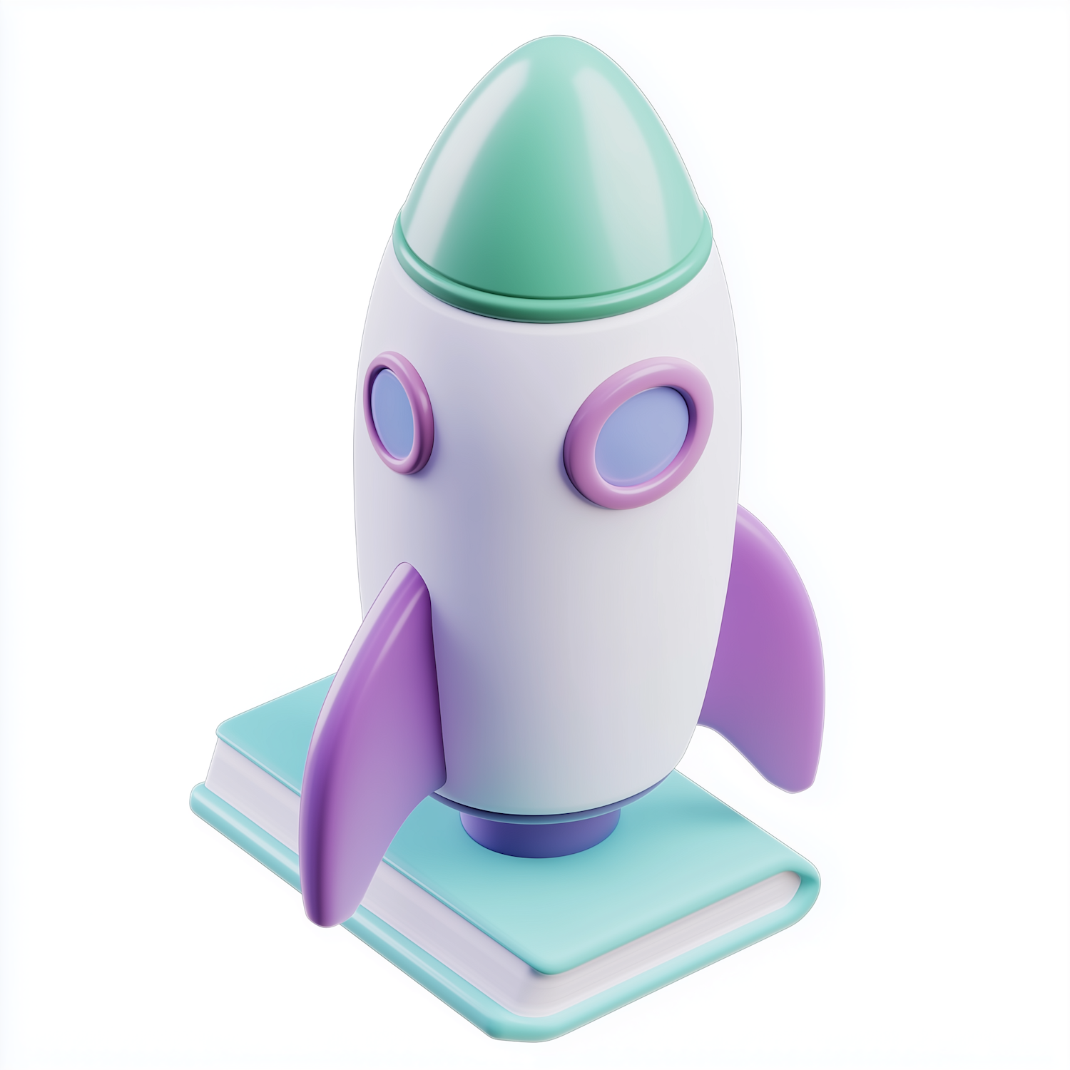 Whimsical 3D rocket ship with pastel colors resting on a book, perfect for creative and educational themes.