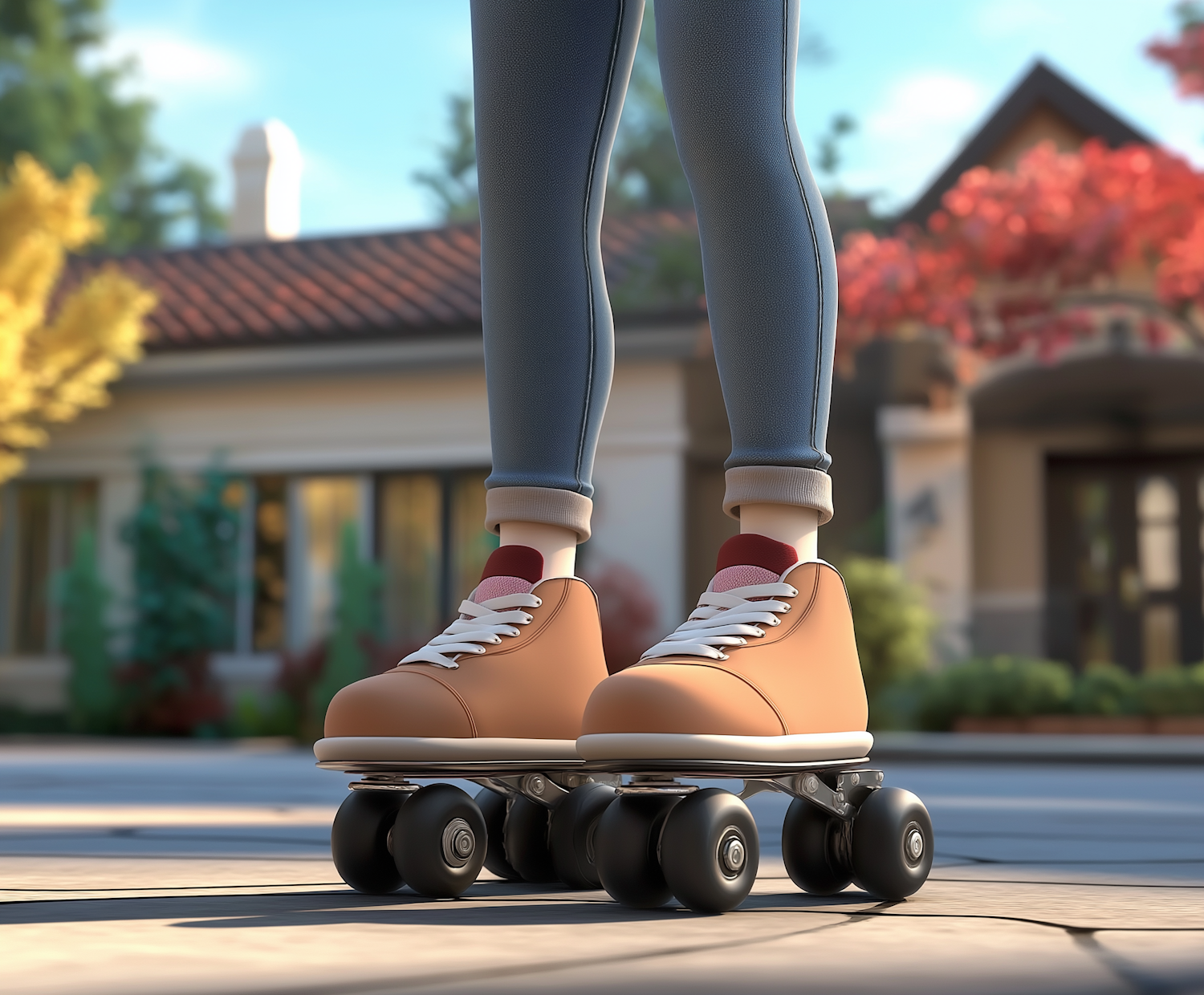 Close-up of tan roller skates with white laces on a sunny day in a suburban neighborhood, featuring blurred houses and trees.