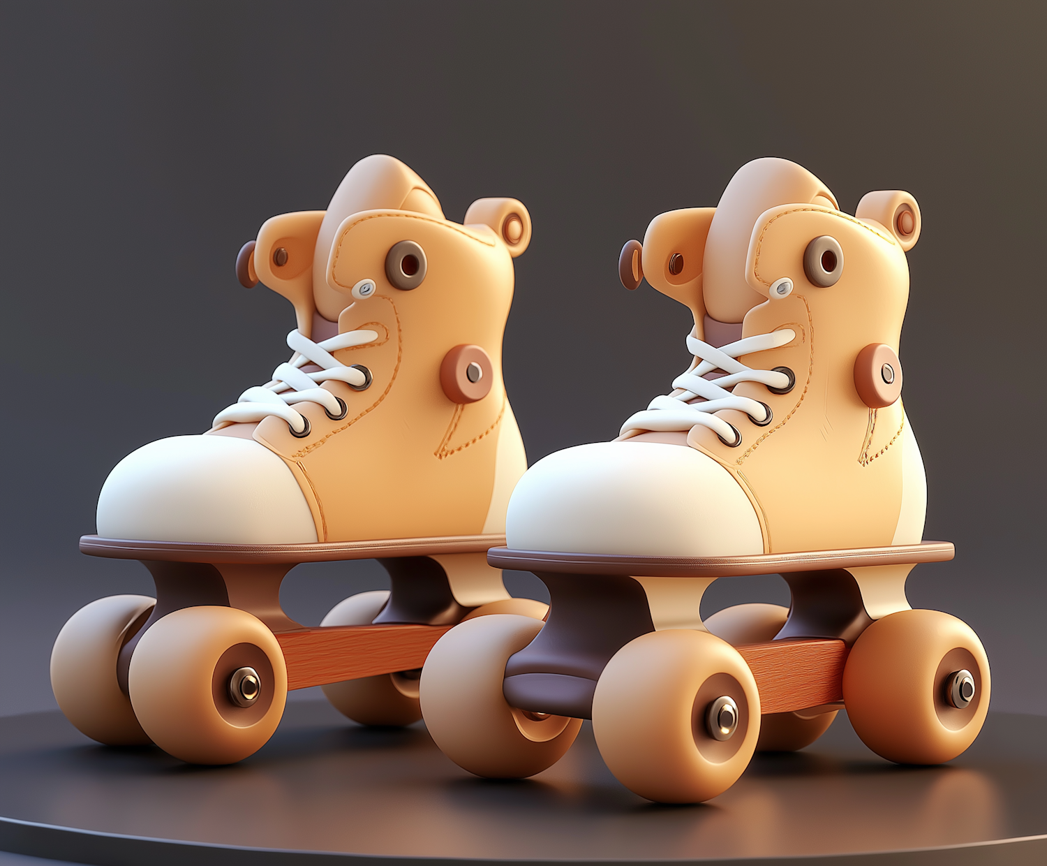 Charming beige roller skates with white accents and brown wheels, blending nostalgic and modern design elements.