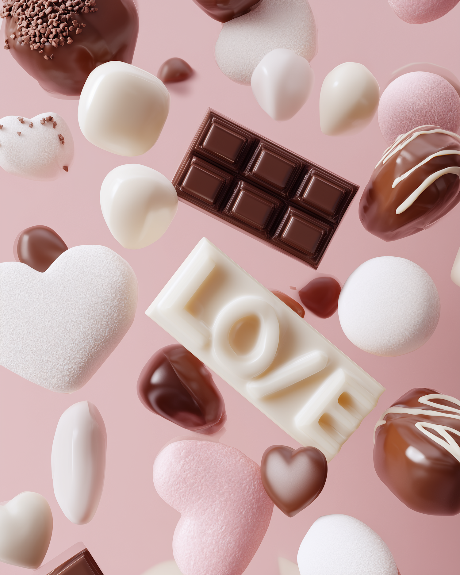 A delightful assortment of chocolates and candies, including heart shapes and a 'LOVE' bar, floating against a soft pink background.