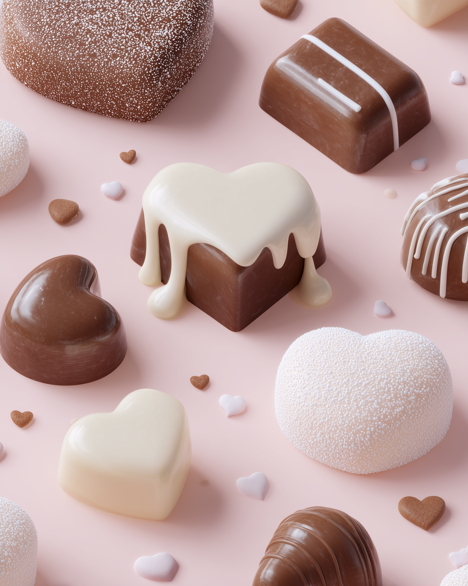 A charming assortment of heart-shaped chocolates with various textures and decorations on a pink background, perfect for a romantic theme.