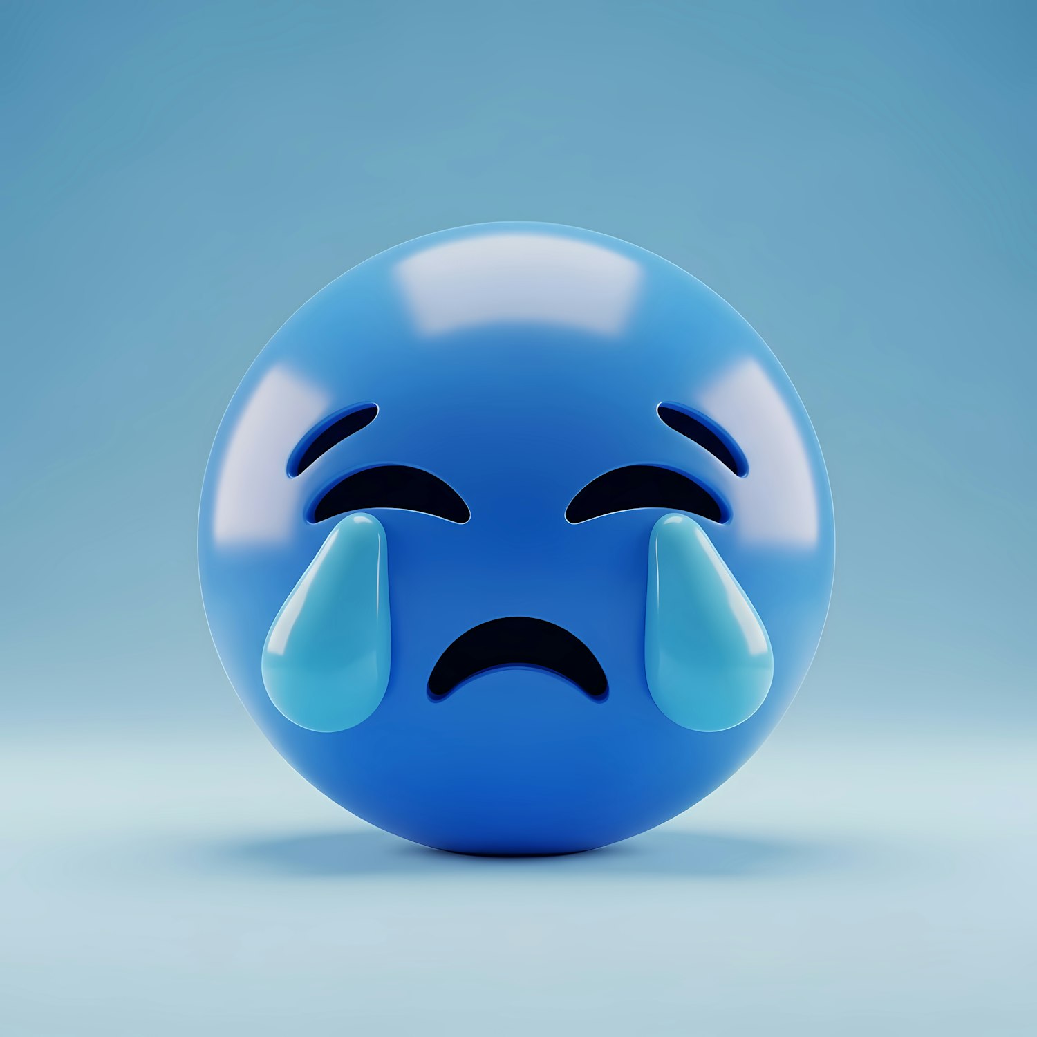 A 3D blue crying emoji with a sad expression and teardrops, set against a soft blue gradient background.
