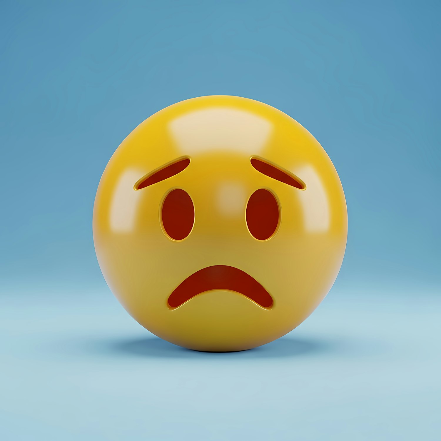 3D-rendered sad emoji with a yellow face and a frown, set against a light blue background. Perfect for expressing emotions visually.