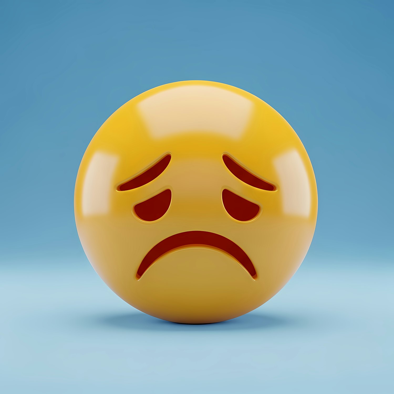 3D-rendered sad emoji with a yellow face, downturned eyes, and a frown, set against a soft blue gradient background.