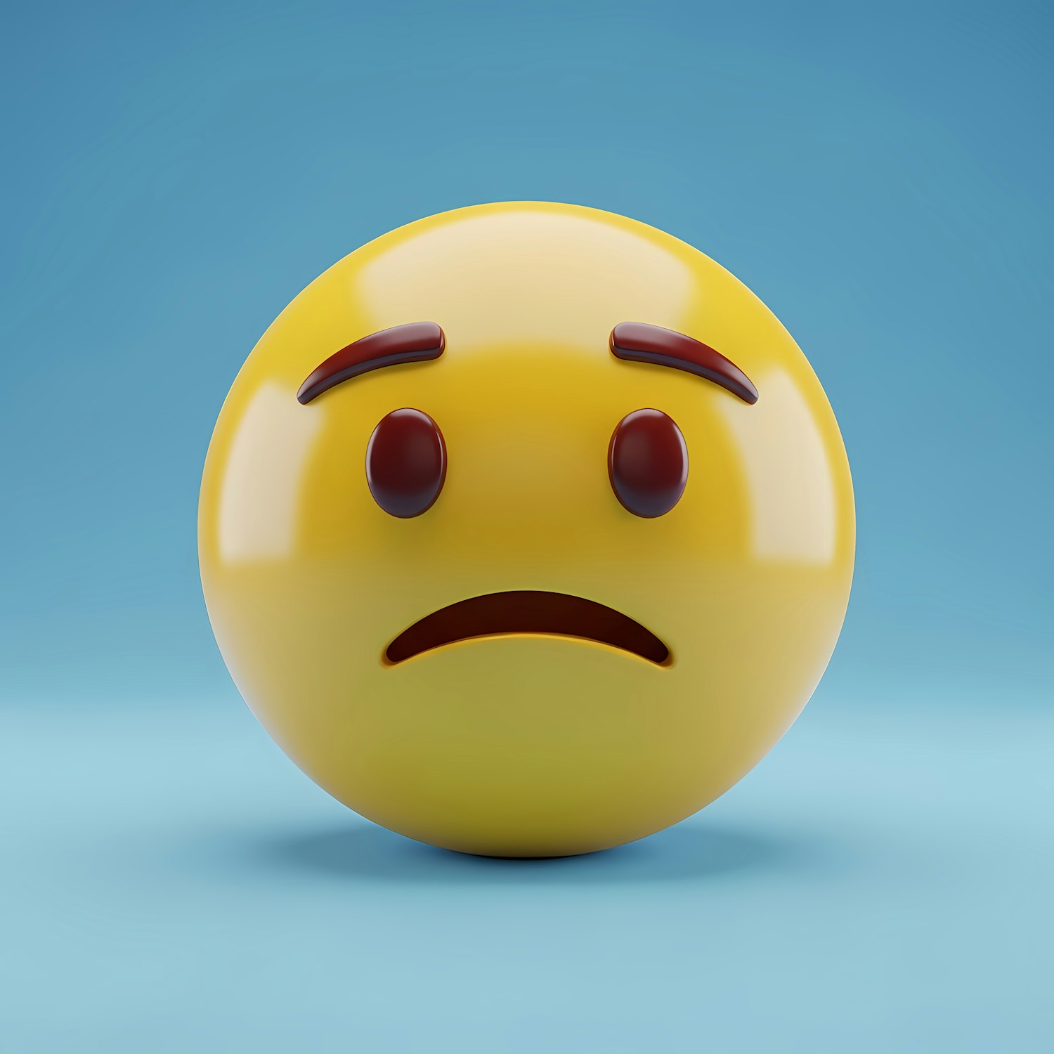 3D-rendered sad emoji with a yellow face, raised eyebrows, and a frown, set against a soft blue background.