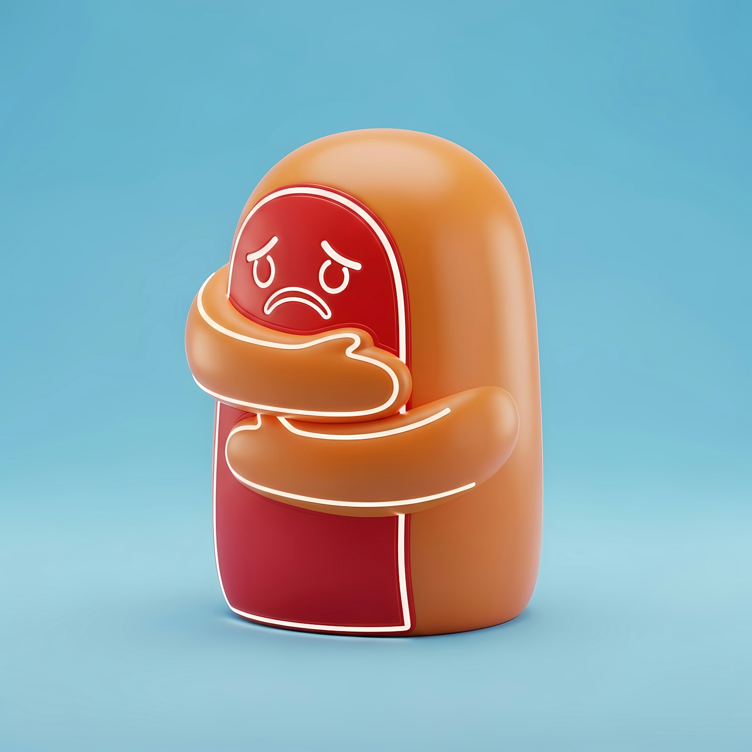 Cute 3D illustration of a sad sausage character hugging itself, with vibrant colors and a glossy finish on a light blue background.