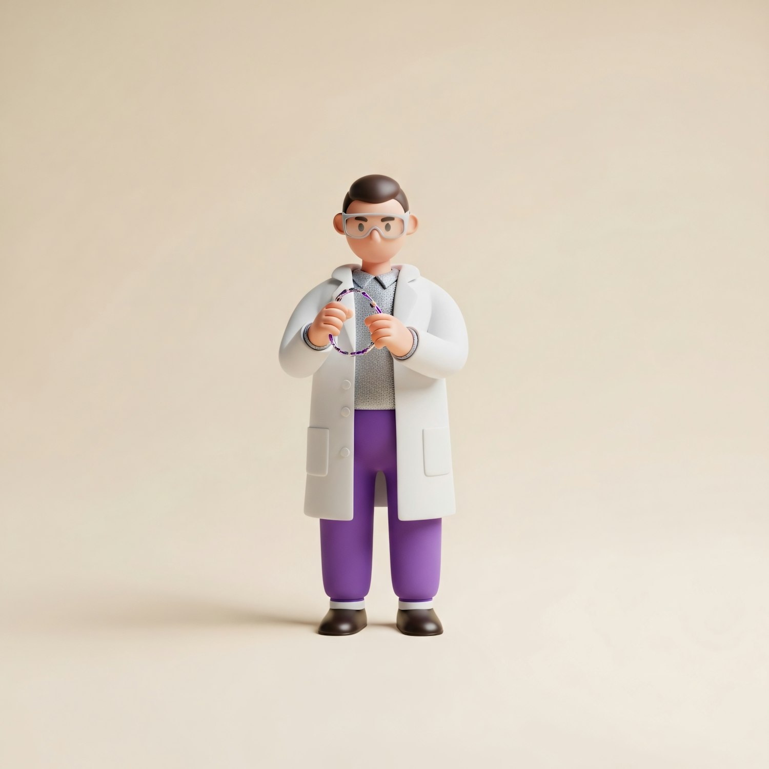 A 3D illustration of a scientist holding a DNA model, wearing a white lab coat and purple pants, set against a light beige background.