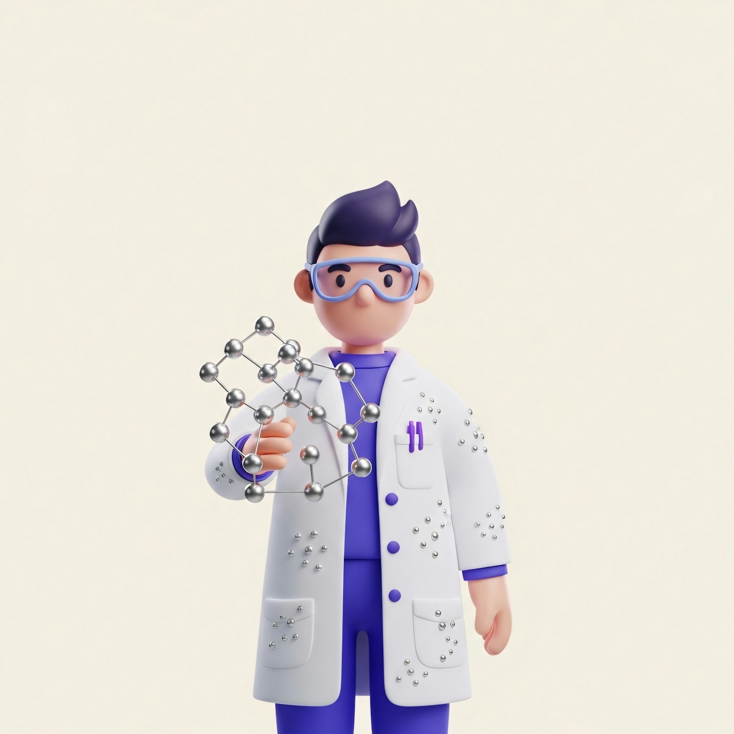 A 3D illustration of a scientist holding a molecular model, wearing a lab coat and goggles, set against a light beige background.