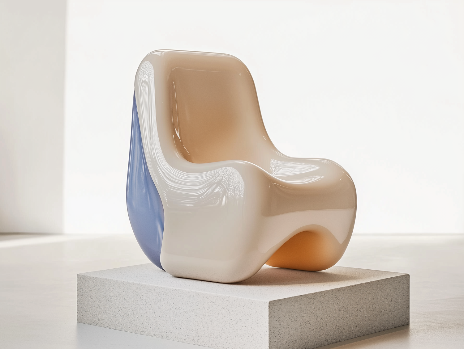 Sleek modern chair with a glossy finish, blending cream, orange, and blue tones, displayed on a white pedestal in a minimalist setting.