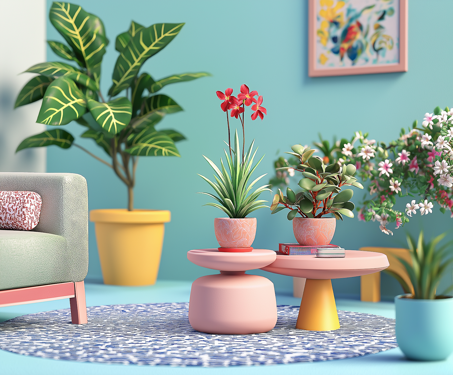 Colorful living room with pastel furniture, vibrant plants, and abstract art, creating a cheerful and inviting atmosphere.