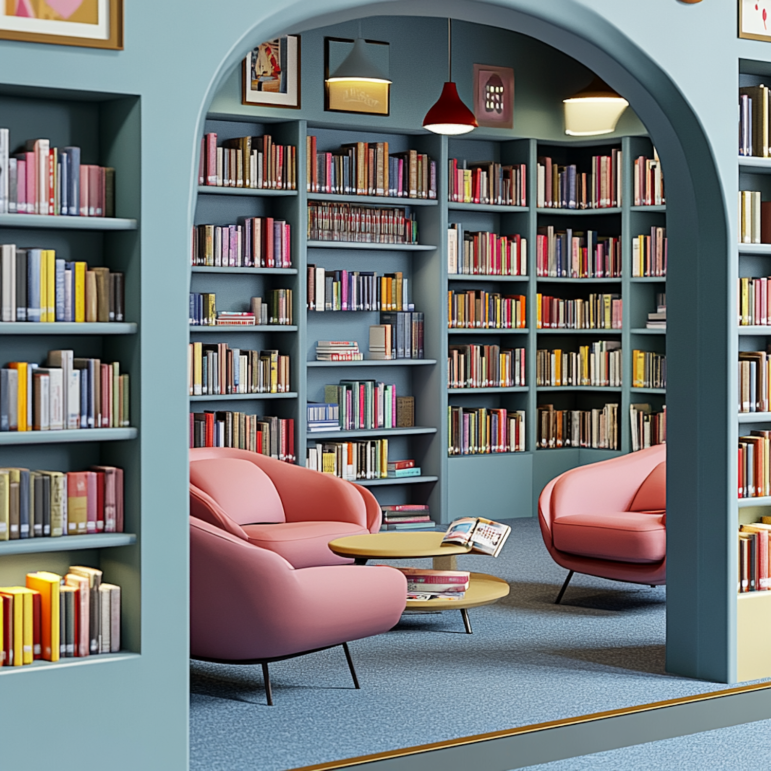 Cozy library with teal shelves, pink armchairs, and warm lighting. Perfect for reading and relaxation.