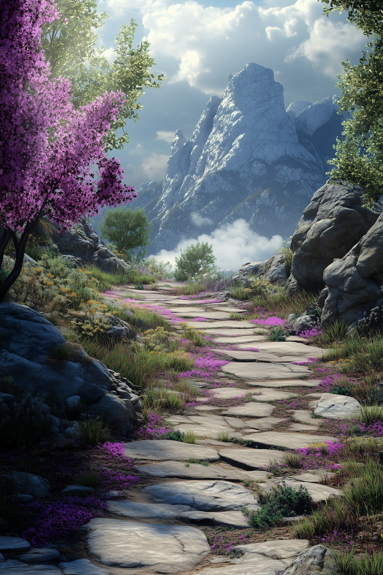 Scenic mountain path with vibrant purple flowers, rocky terrain, and towering peaks under a partly cloudy sky.